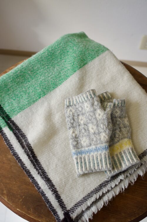 2019年「ゴフスタインと私」展で試作したサンカグローブは、小さな間違いに気づき、片方は指先まで編み上げていたけれど、もう片方は手の平まで編んで、そのまま置いていた。