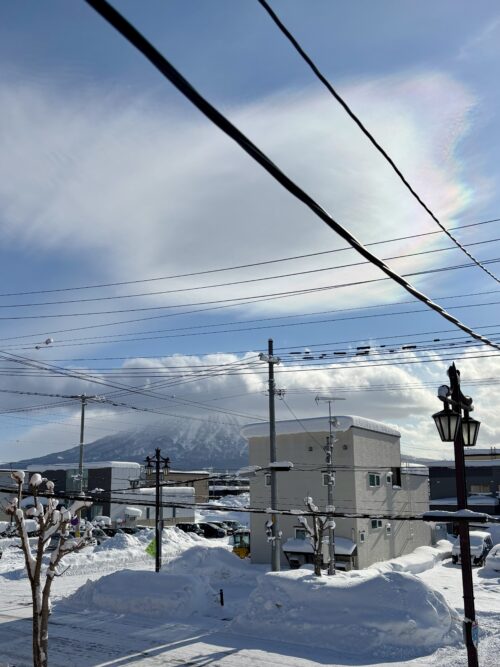 羊蹄山が向こうにそびえ、雪をはらんだ雲が浮かぶ。その雲の厚みは、やはり広島のこの季節のそれとは違う重みを抱えている。そして青空も広がり、雪と相まって光が溢れてた。